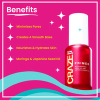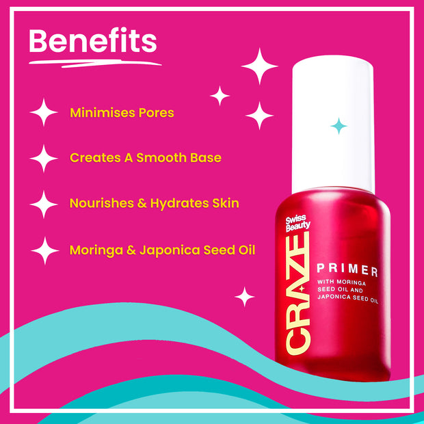 The Swiss Beauty CRAZE Face Primer works as the perfect smoothing and hydrating base for your makeup. It helps create a fresh and flawless canvas by minimising pores and maximising hydration. Enriched with Moringa Seed Oil and Japonica Seed Oil, this primer keeps your skin nourished and moisturised from within. So, part ways with pores and blemishes and say hello to a clean, smooth base for your makeup with the Swiss Beauty CRAZE Face Primer.