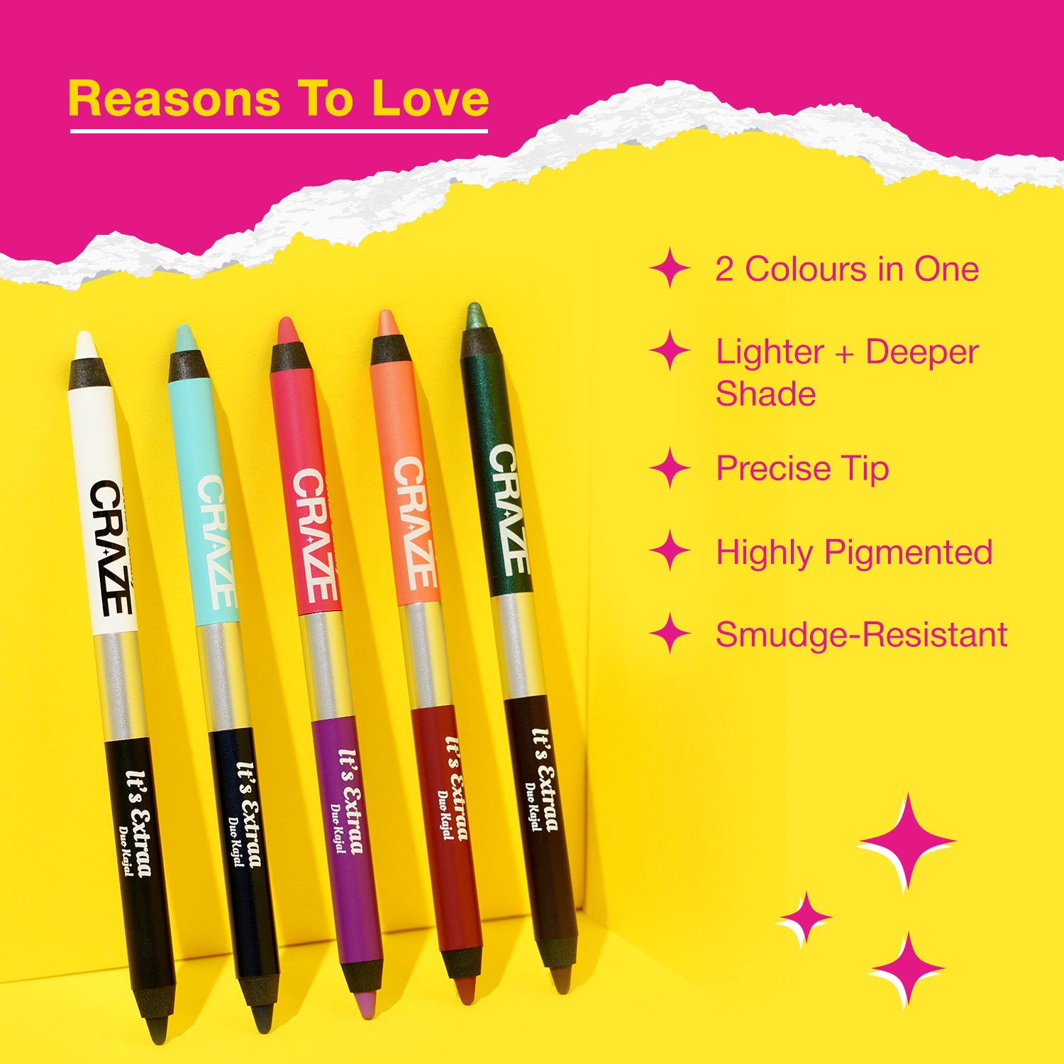 - 2 Colours in One Kajal: The CRAZE It’s Extraa Duo Kajal features two shades in one. You have a lighter colour on one side and a darker colour on the other. So, fun and multifunctional eye looks are just a glide away.