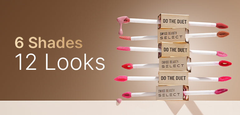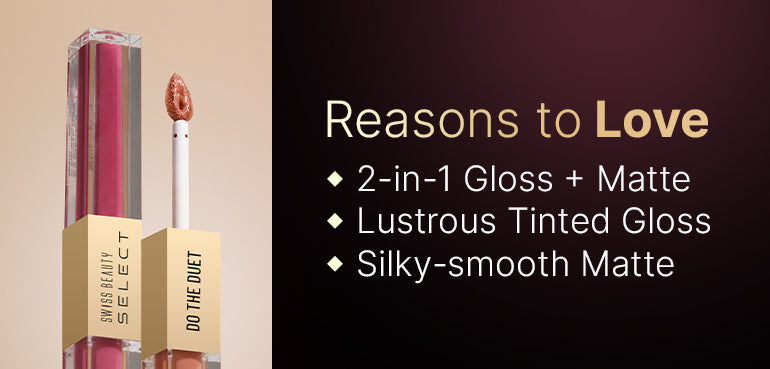 Multifunctional masterpiece for the multidimensional women. Introducing Swiss Beauty Select Do the Duet Gloss + Lipstick - a unique 2-in-1 lip solution for versatile looks. This dual-ended wand features a velvet matte liquid lipstick on one side and a dazzling tinted gloss on the other. Its matte lipstick is loaded with saturated pigments that stay put throughout the day, without budging, smudging, or cracking, while the luxe lip gloss offers a glazed-lip effect sans any stickiness. The skin-loving Jojoba Oil is an antioxidant powerhouse that heals and hydrates your lips, and the Vitamin E extracts lock in moisture and nourishment. Available in six flattering shades that can create 12 diverse looks, our Do the Duet range proves that good things always come in pairs.
