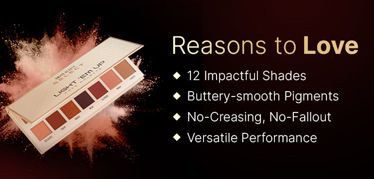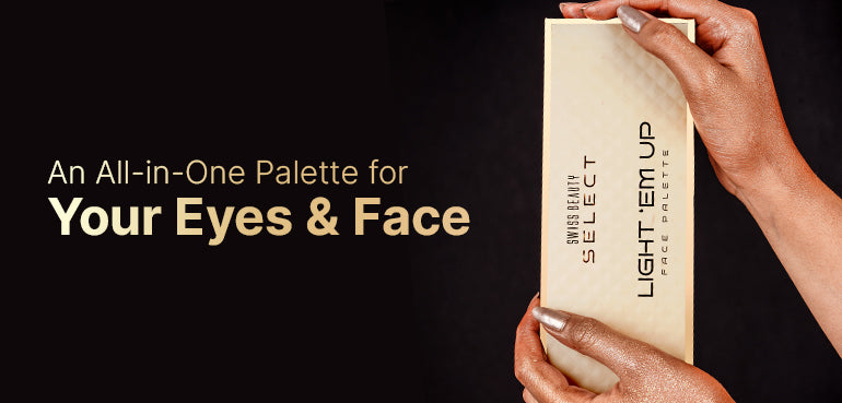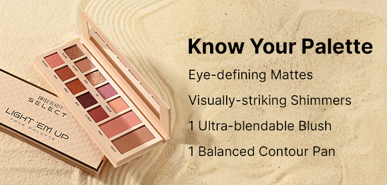 Add new life to your makeup regime with the Swiss Beauty Select Light’em Up Face Palette - an all-rounder makeup palette that takes care of your eyes and face. Featuring 10 intensely pigmented eyeshadows, a flattering blush pan, and a balanced contour shade, this multifunctional maven checks all the right boxes. The eyeshadows feature four velvet mattes, three stunning shimmers, one wet-looking gunmetal shade, and two foiled marble pans. So, whether you want to create a soft eye look for the day or a sultry night look, this palette has got your back. The blush and contour pans are designed to show up on and flatter all Indian skin tones. So, mesmerising eyes, chiselled cheekbones, and a soft flush of colour are packaged to perfection in this multi-dimensional palette. With buildable shades, a no-fallout formulation, and long-lasting pigments, our Light’em Up Face Palette will add new spark to your on-the-go makeup looks.