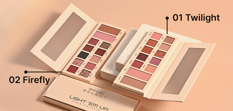 You can use our Light’em Up Face Palette to create a wide range of eye looks, such as brown-toned neutrals, mauve-toned pink looks, dark smokey eyes, soft and glittery pink-toned looks, and more.