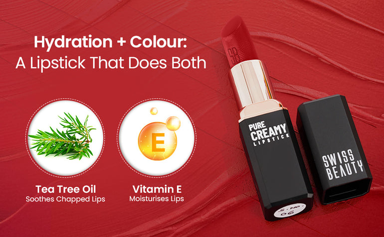 Hydrating: Infused with the goodness of Vitamin E and Tea Tree Oil, this lipstick keeps your lips soft, nourished, and comfortable all day long