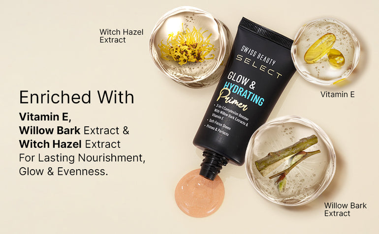 The Swiss Beauty Select Glow & Hydrating Primer is infused with Vitamin E, Witch Hazel Extract, and other potent antioxidants that nourish, hydrate, and brighten your skin from within.